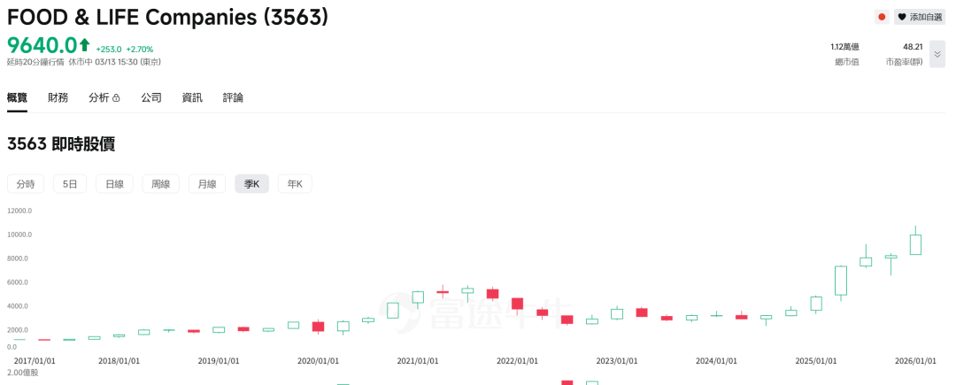 2025年一整年,得益于在中国市场的强劲表现,寿司郎的股价一路高歌猛进,市值突破一万亿日元,目前仍处于不断创新高的上升通道中。按照它的计划,到2035年,在中国的门店数要达500家,是现在的7倍。