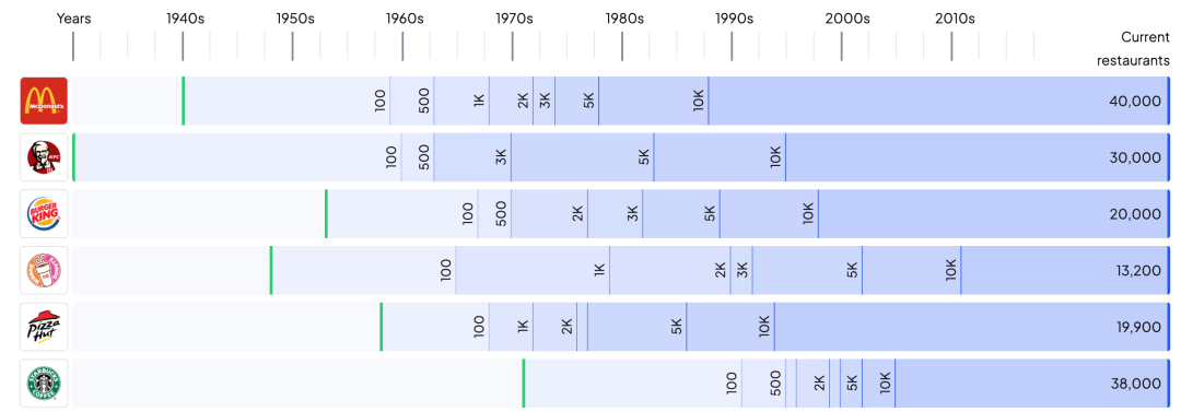 肯德基从创立到突破万店用了43年,麦当劳用了33年,星巴克用了35年。而在中国,蜜雪冰城花了21年突破万店,瑞幸用不到六年,库迪甚至将这一周期压缩到两年以内。